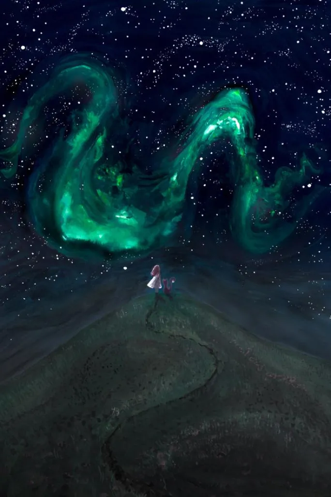 Et fantastisk print af det magiske nordlys. På en mørkeblå baggrund skinner den grønne bølge af lys over en ung pige med sin kat. Den unge pige står på toppen af en bakke og kigger op på stjernerne. Et dejligt og sjovt billede til at hænge i dit barns soveværelse.