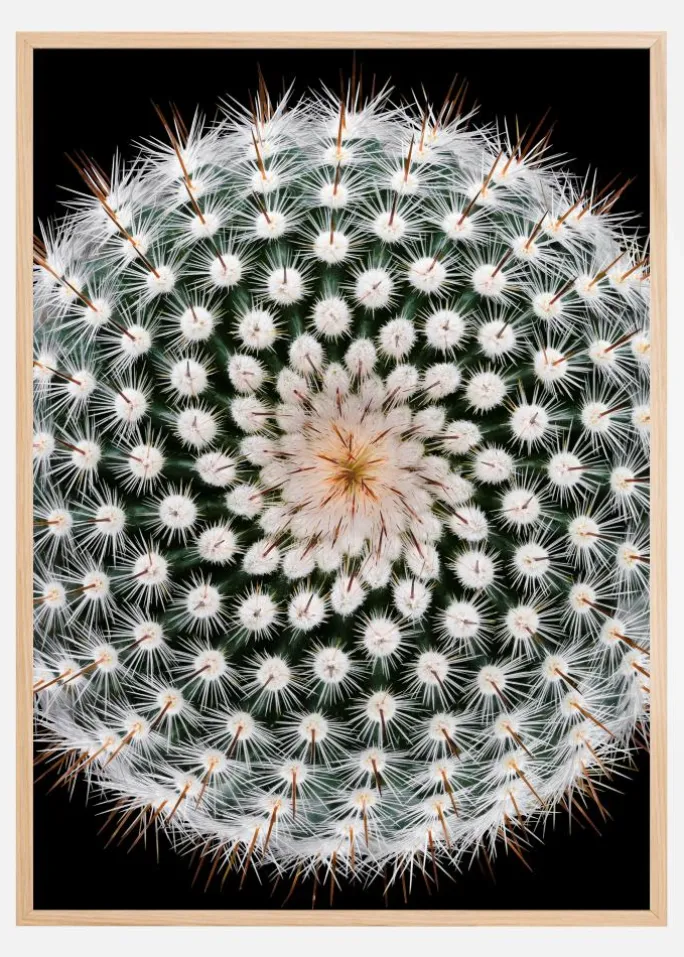 Et luftfoto print af en kaktus med hvide blomster. På en sort baggrund fremhæver den mørkegrønne farve de hvide blomster og de spidse pigge. Den centrale del af planten har et let gult strejf, hvilket giver printet en ekstra smule farve. Et ideelt print til alle, der elsker planter.