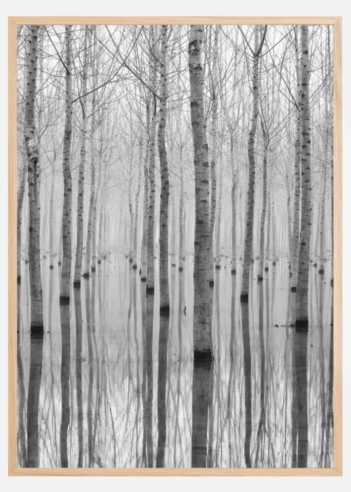 Et foto af perfekt arrangerede skovtræer om vinteren. Dette sort-hvide foto har træer med sorte mærker i samme højde. De høje, nøgne træer er omgivet af vand og afspejles i vandet. Den dystre tågeagtige atmosfære giver printet en uhyggelig følelse. Hæng dette billede op i et farverigt miljø.