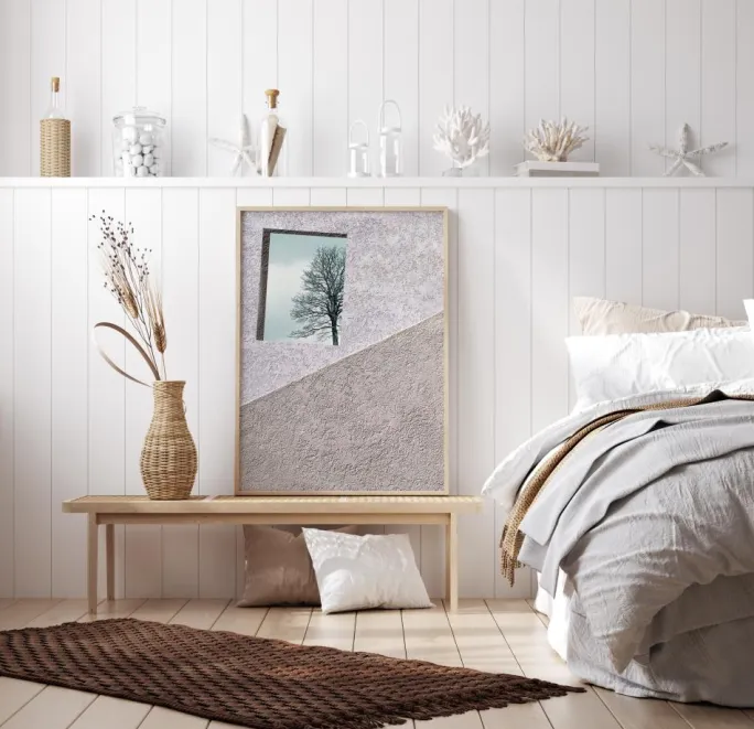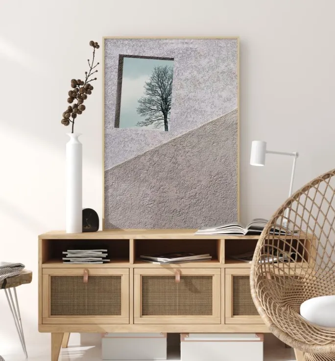 En delikat plakat af lyserød og brun væg. Den groft pudsede væg er delt i to dele, På den lyserøde side af væggen kan man se en skyblå himmel med et træ i forgrunden, mens den brune væg er nøgen. Et kreativt billede til ethvert moderne hjem.