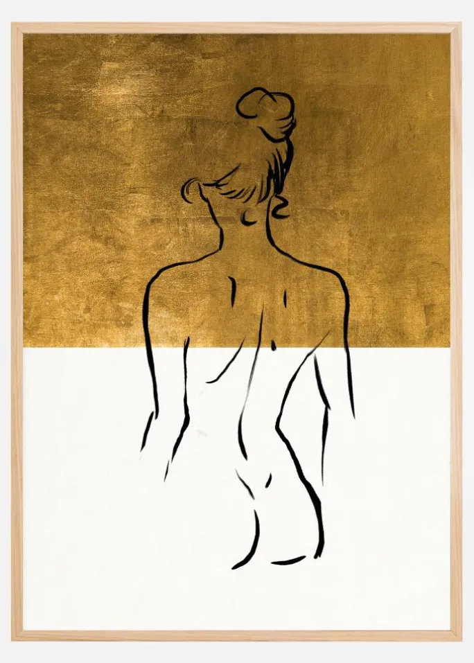 Den luksuriøse guldtonen i baggrunden giver en rig kontrast mod de rene sorte konturer, hvilket resulterer i et kunstværk, der stråler af både varme og enkelhed. Denne print er mere end bare en interiørdetalje; den er en hyldest til den kunstneriske repræsentation af den menneskelige form, ideel til at skabe et sofistikeret og inspirerende miljø i dit hjem eller kontor.