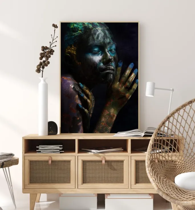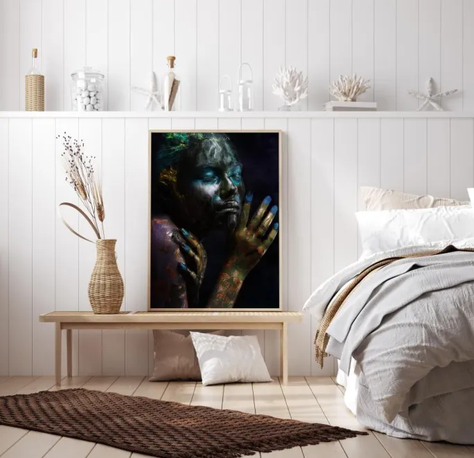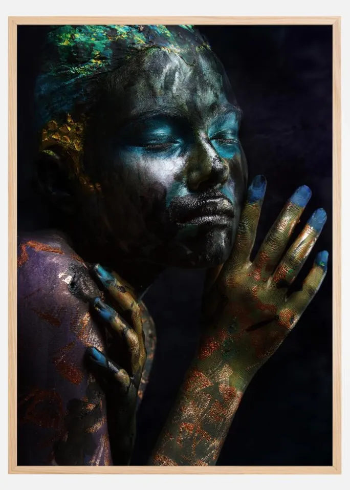 Et betagende print af en kvinde dækket af maling. På en sort baggrund er kvinden dækket af farvestrålende maling i lyse farver. Med det naturlige lys, der skinner på kvindens ansigt og skuldre, fremhæves intensiteten af farverne. Et smukt print til at sætte farve på en hvid væg.