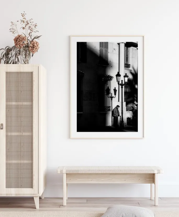 Et fotografi i sort-hvid af en ældre mand, der med et søgende blik står og betragter noget omgivet af byens livlige skyggespil. En rolig og fin plakat, som gør sig lige så godt alene som sammen med andre favoritter på en større billedvæg.