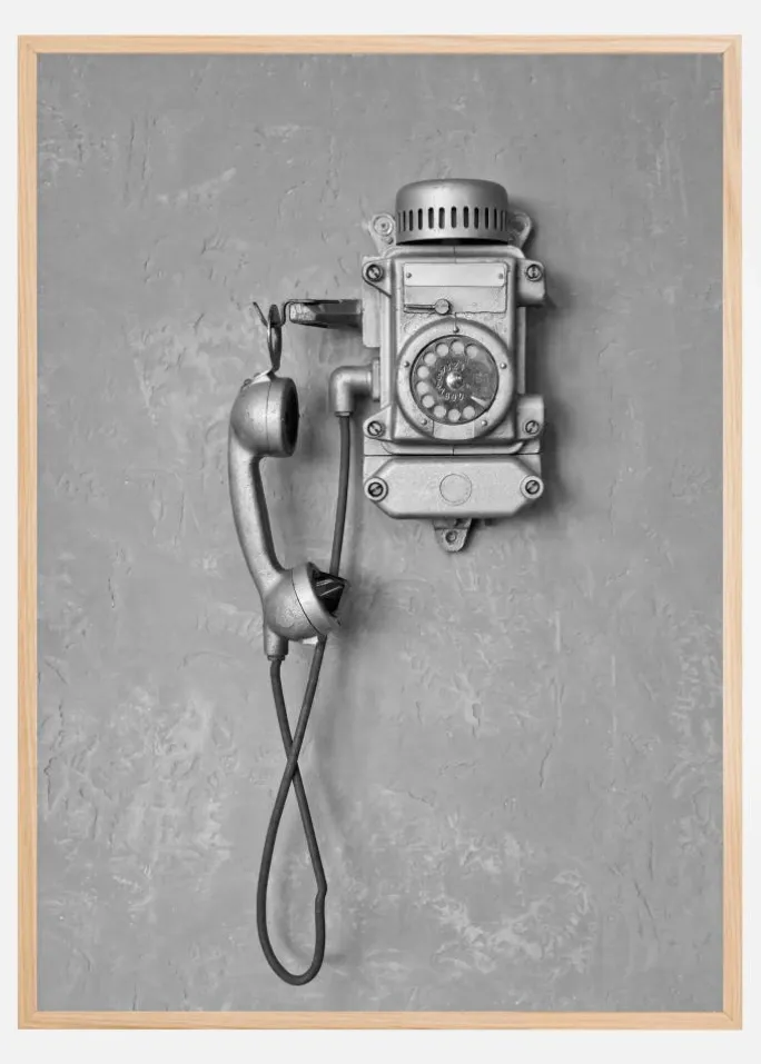 Denne nostalgiske plakat fremviser et klassisk sort-hvidt billede af en gammel vægmonteret telefon, en påmindelse om kommunikationens tidligere dage. Den robuste konstruktion af telefonen med sin drejeskive og den tunge lytter hænger på en forhøjet krog, mens selve ledningen draperer elegant langs med væggen. Denne historiske artefakt er fanget mod en enkel baggrund, der fremhæver dens industrielle charme.