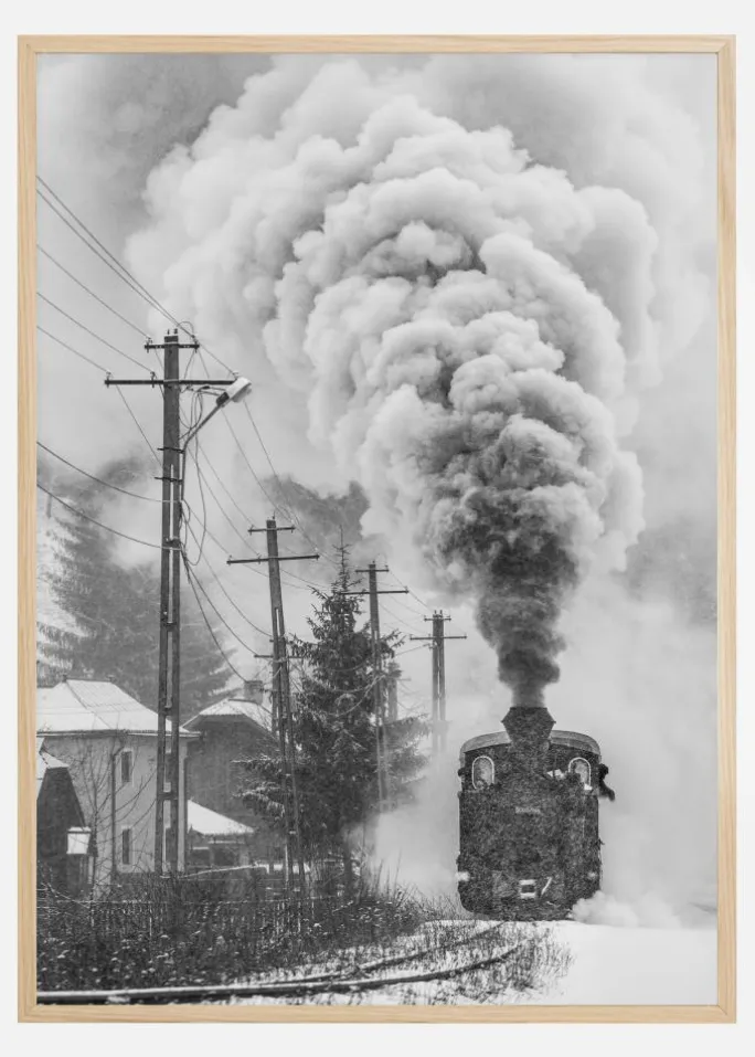 En dramatisk plakat af et damptog i sneen. Lad dig suge ind i det episke aspekt i dette billede, når røgen står højt op. Skab ægte vinterstemning i dit hjem med dette billede.