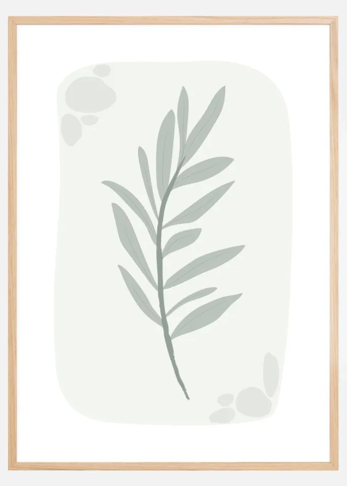 Et fredfyldt print af et olivenblad på en cremefarvet baggrund. De bløde grønne toner på olivengrenen passer perfekt ind i den cremefarvede baggrund. I øverste venstre og nederste højre hjørne er der malet fire beigefarvede sten. Dette print ville se smukt ud, hængt op på en cremefarvet væg.