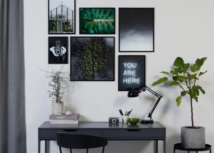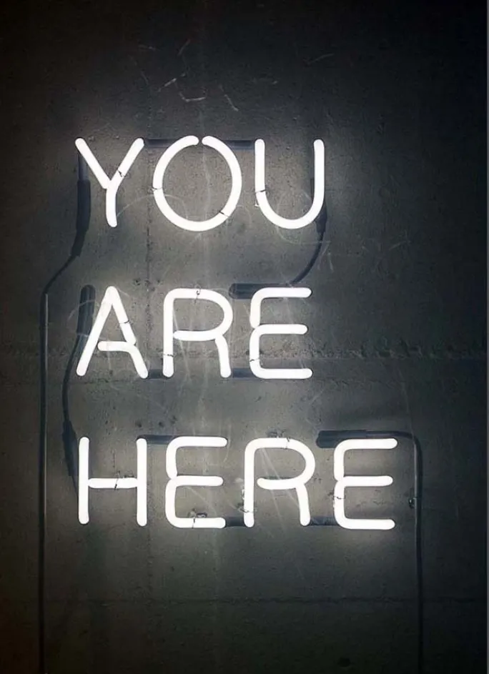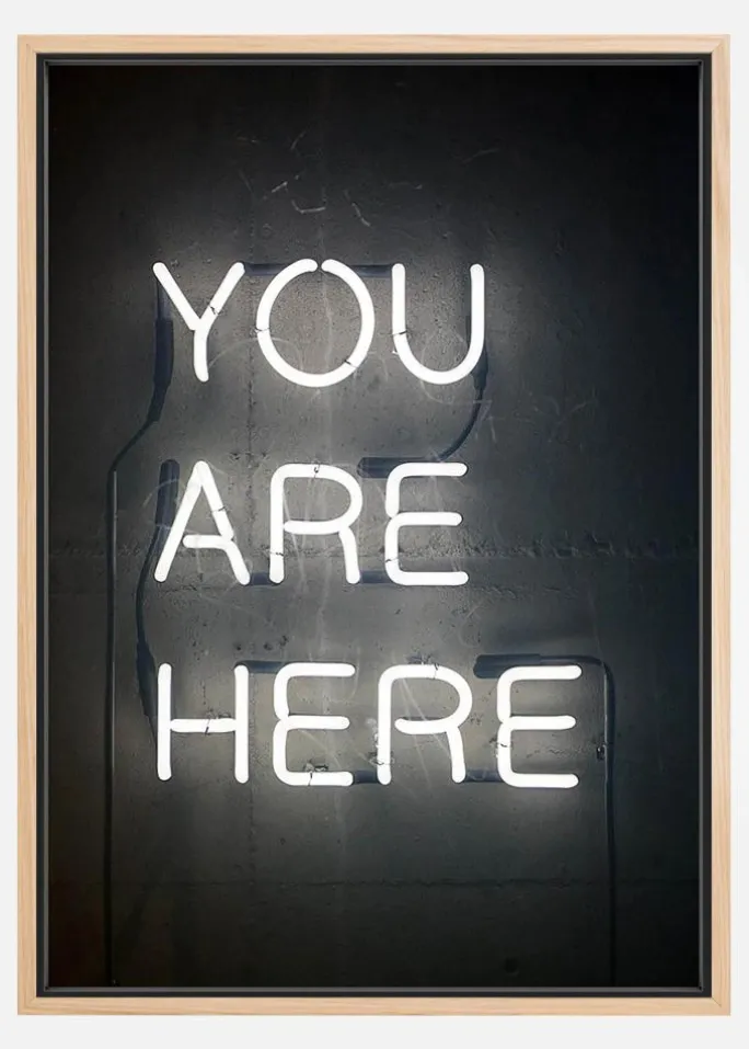 En sort-hvid tekst plakat af et neonskilt med den informative tekst “You are here”. En enkel og stilren plakat med et behageligt humoristisk element, perfekt at kombinere med andre af vores fantastiske motiver på en større plakatvæg.