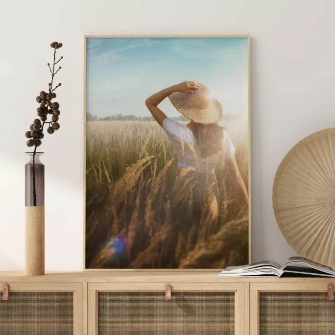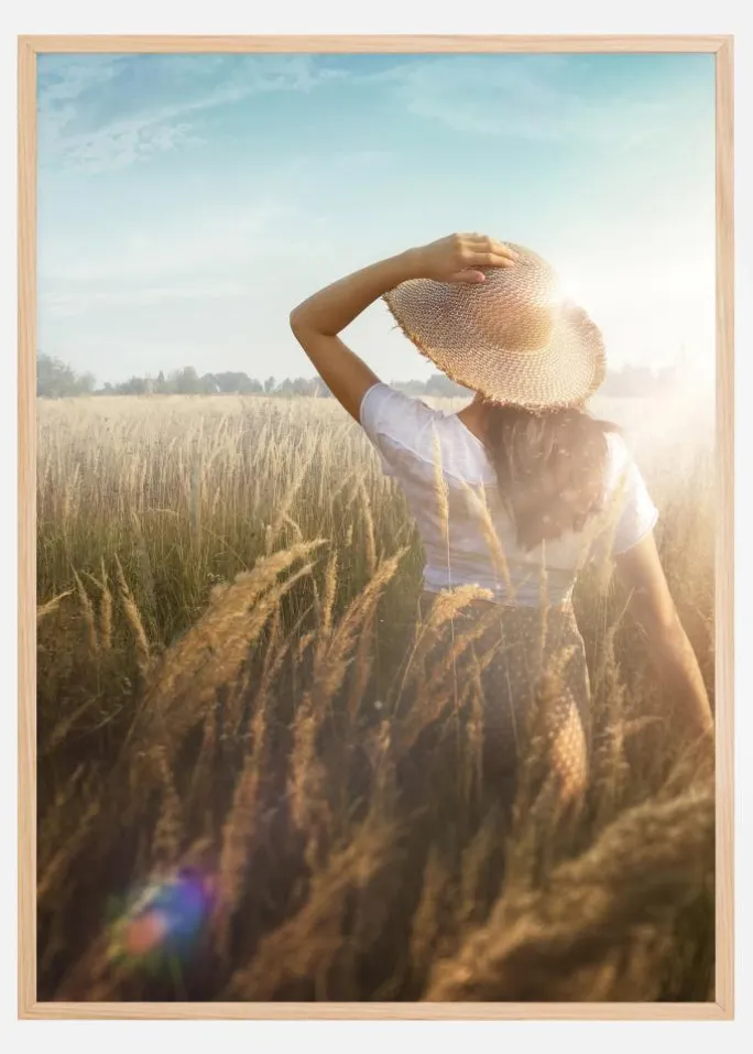 Et afslappende og friskt print af en kvinde med stråhat i hvedemarken. Den smukke blå himmel møder den gyldne hvedemark. Med hånden lagt på hovedet slentrer en ung kvinde gennem markerne og nyder den friske luft. Et ideelt print til alle, der sætter pris på naturens skønhed.