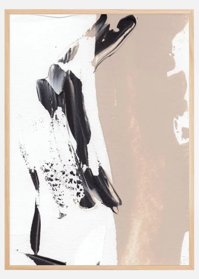 Dette dristige og ekspressive plakat er en fejring af abstrakt kunst og dens evne til at vække følelser og fortolkninger. Den dynamiske komposition af sorte og grå penselstrøg mod den cremede baggrund illustrerer bevægelse og kreativitetens flygtige natur. Spredte stænk og dråber tilføjer en organisk følelse og viser kunstnerens hånd i hver linje og form.