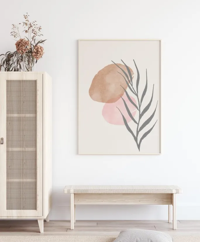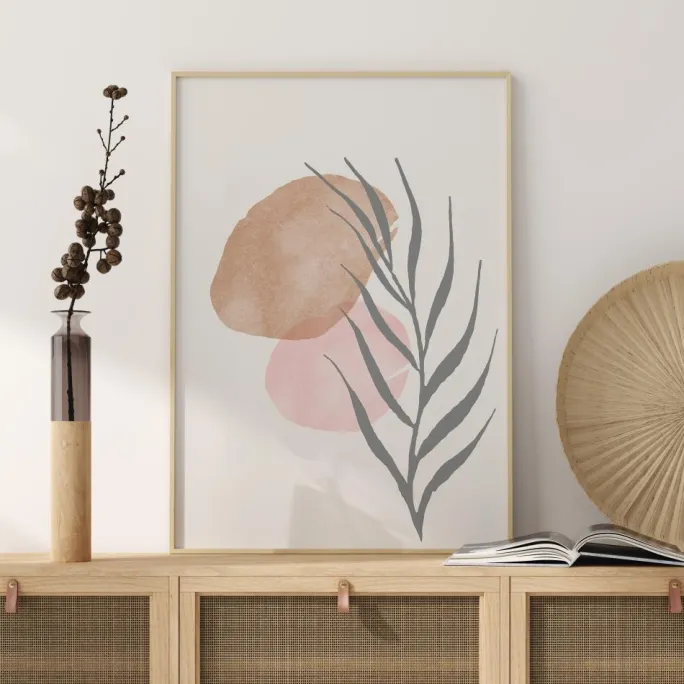Et klart og enkelt maleri af blad. På en hvid baggrund er det grå blad forsigtigt placeret på kanten af to farverige runde blade. De bløde toner i dette print skaber en beroligende atmosfære. Bring stilheden ind i dit hjem med dette smukke, men enkle print.