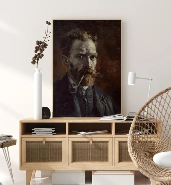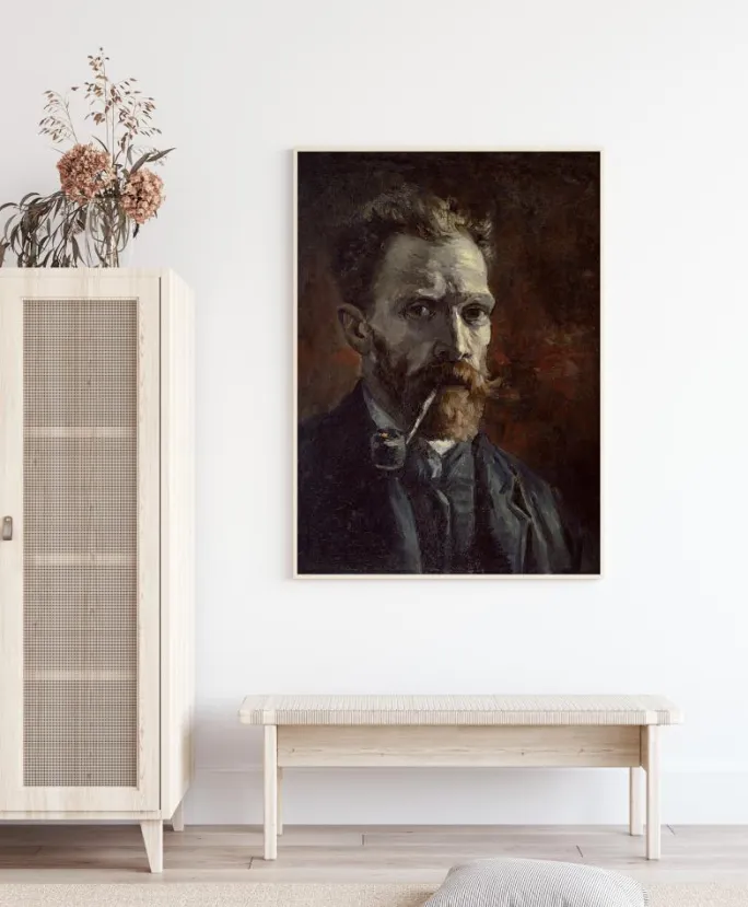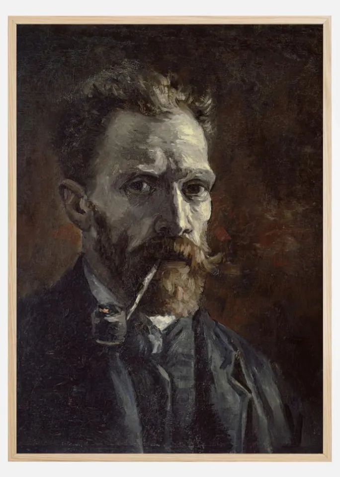 Et magisk maleri af en mand med en pibe. Kunstværket med et gammelt tema har en rustfarvet baggrund, der fremhæver mandens hår og skæg. Klædt i en sort jakke kan mandens hvide skjortekrave ses. Et perfekt print til at hænge i dit arbejdsværelse.
