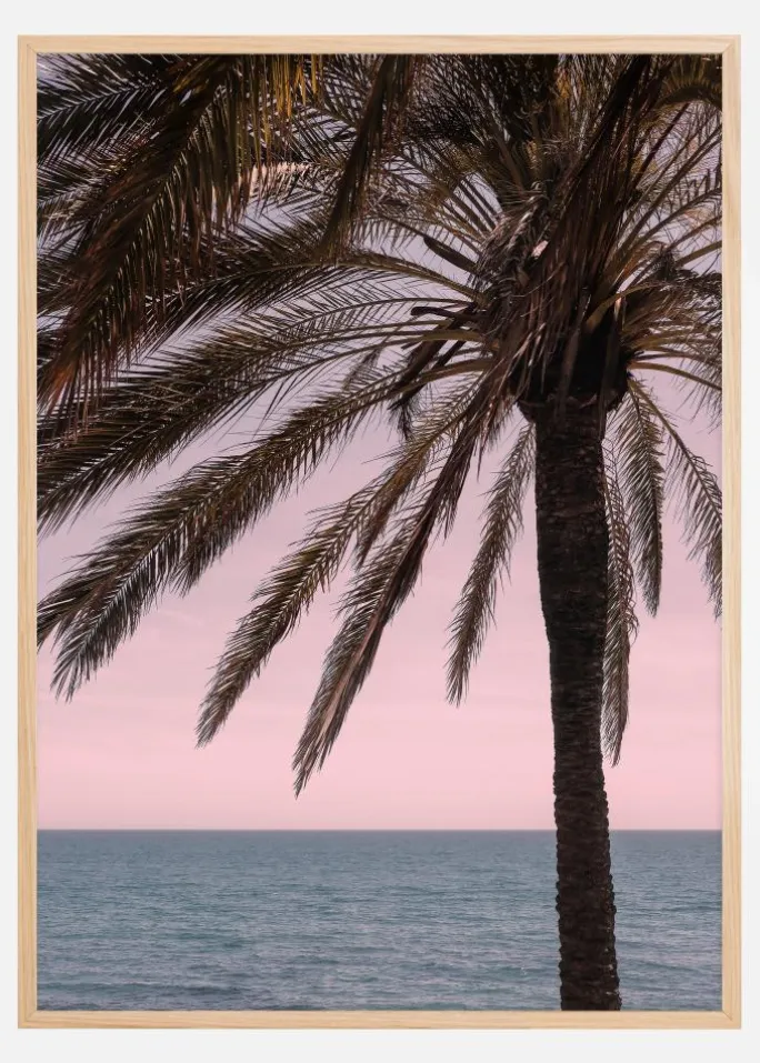 Detaljrigdommen i palmens blade mod den fredfyldte baggrund af himmel og hav skaber en harmonisk og afslappende atmosfære i dette motiv. Farvepaletten af rosa, blå og mørke toner i palmen er både opfriskende og beroligende, hvilket gør denne plakat til et ideelt valg for rum, hvor du ønsker at skabe en afslappende oase eller bare drømme dig væk til en strand langt væk. Denne kunsttryk er en hyldest til naturens skønhed og roen, der kommer med at være tæt på vand.