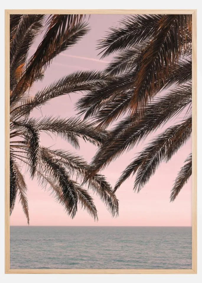 Giv dit rum en følelse af evig sommer med denne plakat, der viser palmebladens dynamiske silhuetter mod en himmel i pastelfarver ved solnedgang. Dette kunstværk fanger den afslappende atmosfære af en stille aften ved havet, hvor de mørke nuancer af palmebladene komplementerer den lyserøde himmel og det spejlblanke hav. Det er en plakat, der vækker minder om dovne dage på en strand langt væk.