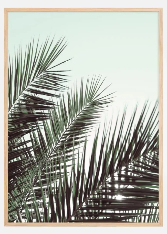 Forvandl dit hjem til en tropisk oase med denne sofistikerede plakat, der afbilder frodige palmeblade mod en pastelfarvet himmel. Denne plakat fanger den lette brise og den ro, der kun kan findes i et varmt klima. De detaljerede grønne blade er smukt fremstillet mod en blød himmelblå baggrund, hvilket skaber en følelse af evig sommer og natur i dit rum.