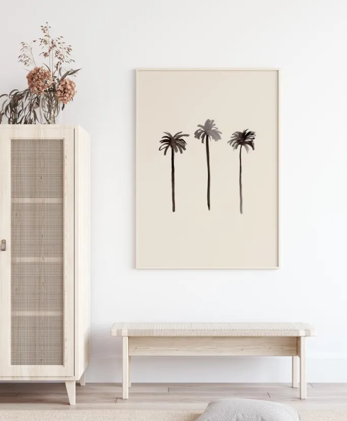 Et simpelt sort-hvidt håndtryk af tre palmer i en række. På en beige baggrund er der brugt forskellige nuancer af sort for at skabe mørket på bladene. Et enkelt print til at hænge på væggen i din stue.