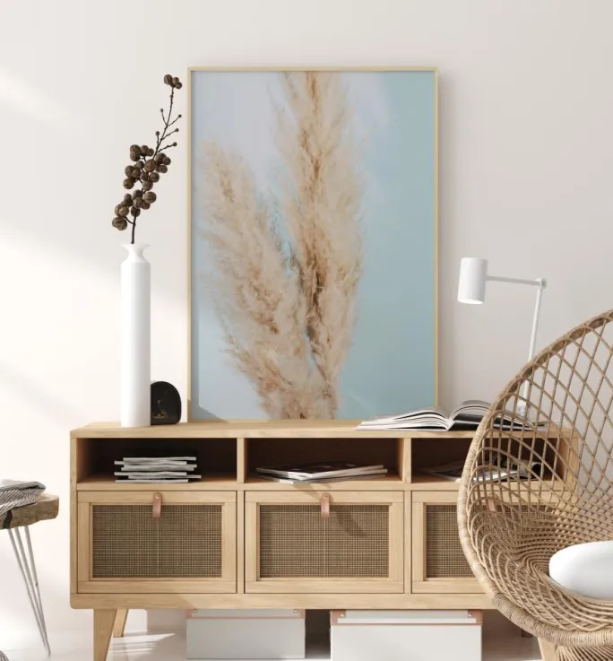 Et portræt af et skinnende cremefarvet pampasgræs foran en blå klar himmel. De sølvhvide fjer er et fedt statement mod den lyseblå himmel. mærk fjerens blødhed, når du hænger dem i dit soveværelse.