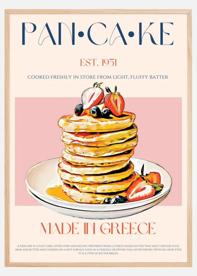 Teksten på plakaten tilbyder ikke kun en æstetisk nydelse men også en pædagogisk indsigt i, hvad en pandekage er og dens kulinariske baggrund. Denne plakat kombinerer skønhed med information på en måde, der ville være perfekt i en madrelateret forretning, køkken eller café og giver en varmende og indbydende følelse til rummet, den placeres i. Med sit klassiske og tiltalende udseende er dette tryk en vidunderlig hyldest til den enkle, men elskede ret.