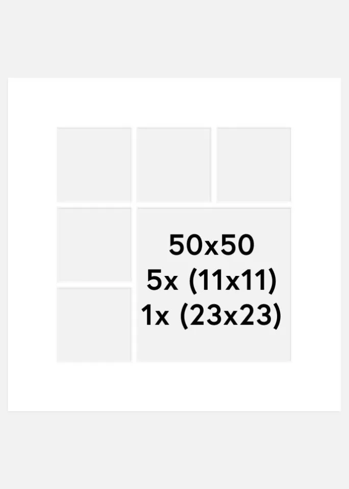 - Indvendige mål passepartout*11,5×11,5 cm (5 st) & 23,5×23,5 cm (1 st)