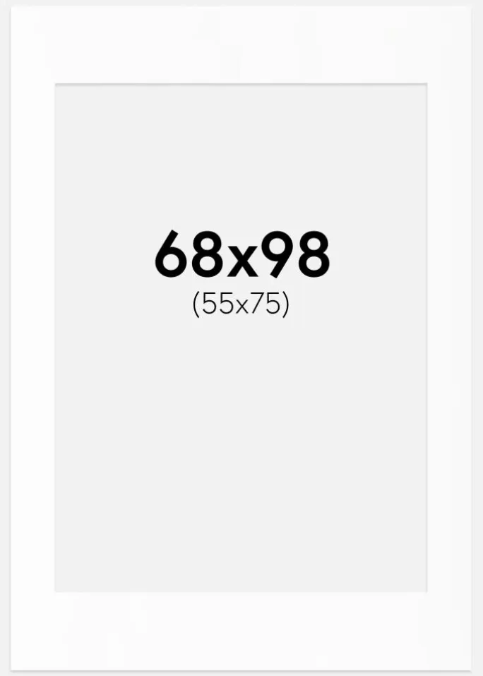 Denne elegante passepartout i hvid nuance er det perfekte valg for at give dine billeder og kunstværker en stilfuld indramning. Med en skråtskåret inderkant i samme hvide farve skabes der en dybde, som fremhæver motivet på en sofistikeret måde. Passepartouten er designet til at passe billeder i størrelsen 56×76 cm, mens ydre mål er 68×98 cm, hvilket giver en smuk og afbalanceret præsentation.