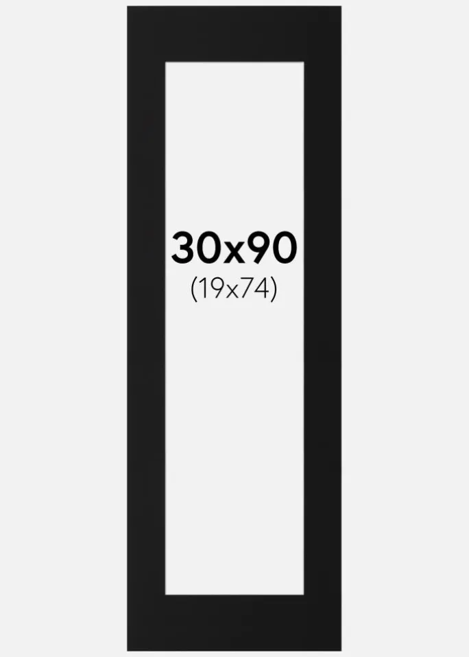 Denne elegante passepartout i sort er det perfekte valg til at give dine billeder en stilfuld indramning. Med en skråtskåren inderkant og en hvid kerne skabes en subtil kontrasteffekt, der giver dybde og elegance til dit motiv. Passepartouten er designet til at passe billeder i størrelsen 20×75 cm, mens ydermålet er 30×90 cm, hvilket giver en smuk indramning med en bred kant.