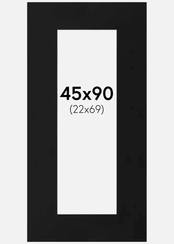 Denne elegante passepartout i sort er det perfekte valg for at give dine billeder og kunstværker en stilfuld indramning. Med en skråskåret indre kant og en hvid kerne skabes der en subtil kontrasteffekt, som giver dybde og elegance til dine motiver. Passepartouten er designet til at passe billeder i størrelsen 23×70 cm, mens ydermålet er 45×90 cm, hvilket gør den ideel til både moderne og klassiske indramninger.