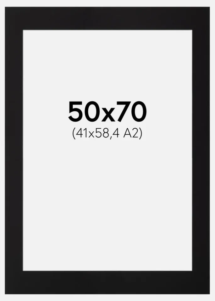Denne elegante passepartout i sort er det perfekte valg for at give dine billeder og kunstværker en stilfuld indramning. Med en skråtskåret indre kant og en hvid kerne skabes en subtil kontrasteffekt, der giver dybde og elegance til dit motiv. Passepartouten er designet til at passe billeder i størrelsen 42.00×59.40 cm (A2) og har et ydre mål på 50×70 cm, hvilket gør den ideel til både moderne og klassiske indramninger.