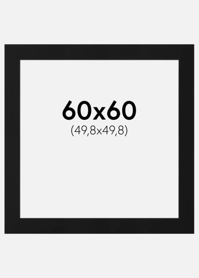 Denne elegante passepartout i sort er det perfekte valg for at give dine billeder og kunstværker en stilfuld indramning. Med en skråskåret indre kant og en hvid kerne skabes en subtil kontrasteffekt, der giver dybde og elegance til dit motiv. Passepartouten er designet til at passe billeder i størrelsen 50,8×50,8 cm (20×20 inches) og har et udvendigt mål på 60×60 cm, hvilket giver en smuk indramning med en jævn og harmonisk kant.