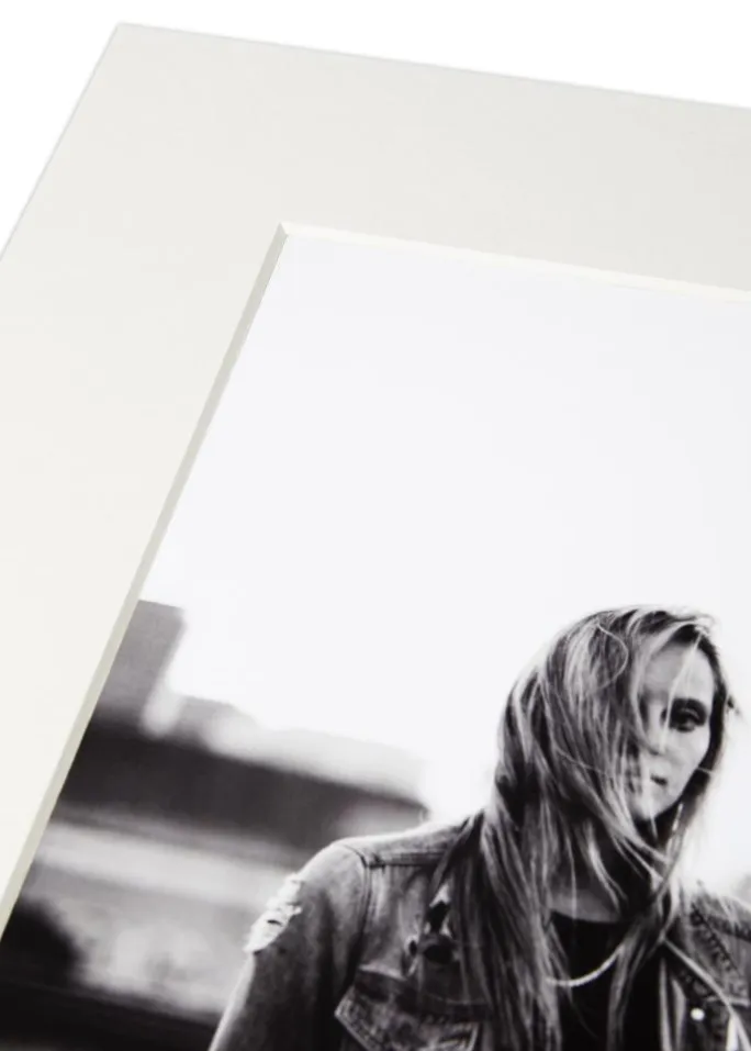 Den skråtskårne indre kant afslører en hvid kerne, hvilket skaber en subtil men effektfuld kontrast, der giver dybde og dimension til dine indrammede værker. Overfladen har en fin struktur, der bidrager til et sofistikeret og tidløst udseende, hvilket gør denne passepartout til et stilfuldt supplement til alle typer af indretninger.