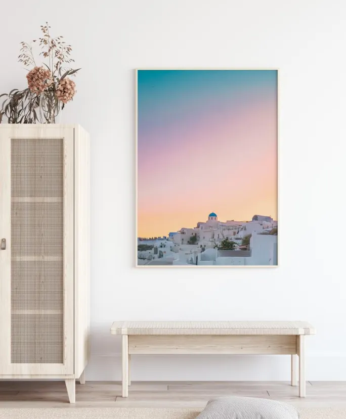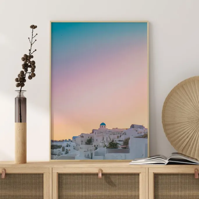 Et naturskønt opslag af en pastelfarvet himmel, der overdådigt oplyser de funklende hvide bygninger. Himlens bløde pastelfarver fremhæver de små hvide huse. I midten af printet står det højeste hus med et blåt kuppelformet tag. Et perfekt print til at hænge i et sommerhus.