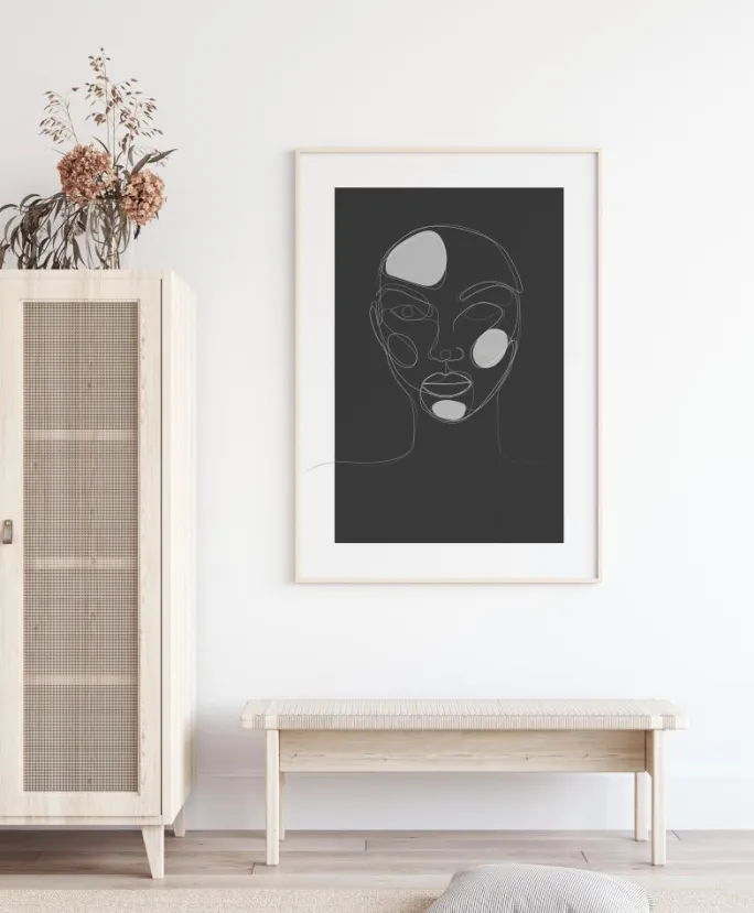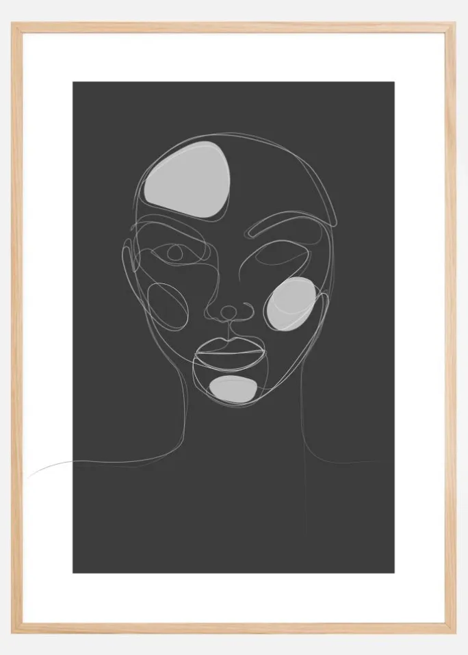 Et fantastisk billede af en kvindes hoved og skuldre er tegnet på en sort baggrund. Tre hvide pletter fremhæver kvindens pande, kind og hage. Printet er en enkelt stregtegning med alle træk skitseret i hvidt. Et kraftfuldt print til at hænge i dit hjem.