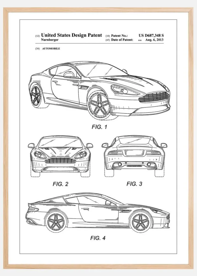 Udforsk kunstens grænser med vores eksklusive kollektion af patentplakater, der hylder de ingeniørkunstens mesterværker. Denne patentplakat viser en ikonisk designpatenttegning af en Aston Martin, med patentnummer US D687,348 S, udstedt den 6. august 2013. Med sit omhyggelige håndværk og præcision fanger denne tegning essensen af avanceret bilteknologi og designfilosofi, hvilket gør den til en fremragende samtalestarter og en kilde til inspiration for alle bilelskere og designelskere.