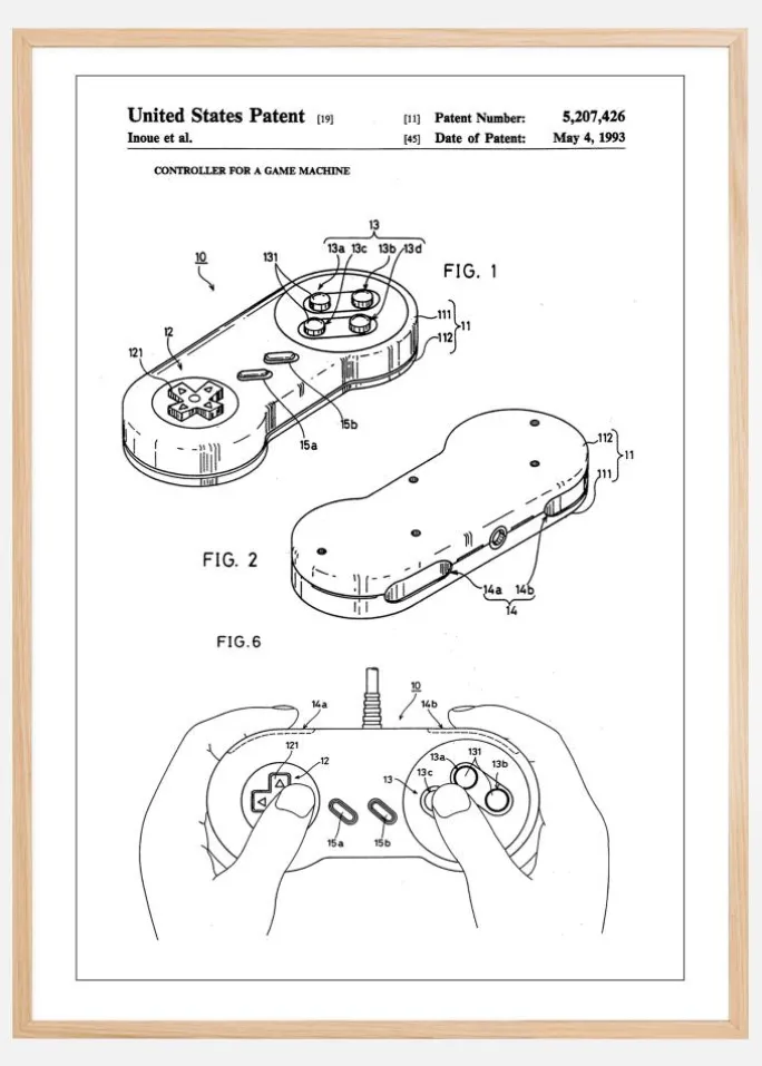Denne patentplakat illustrerer et banebrydende design for en spilkontrol fra Nintendo, patentnummer 5.207.426, dateret 4. maj 1993. De forskellige visninger af tegningen viser håndkontrollens komplekse opbygning og ergonomiske design, som banede vejen for, hvordan vi interagerer med digitale spilleverdener. Det er et kulturelt ikon, der repræsenterer en epoke, hvor spilindustrien gennemgik enorme forandringer og innovationer.