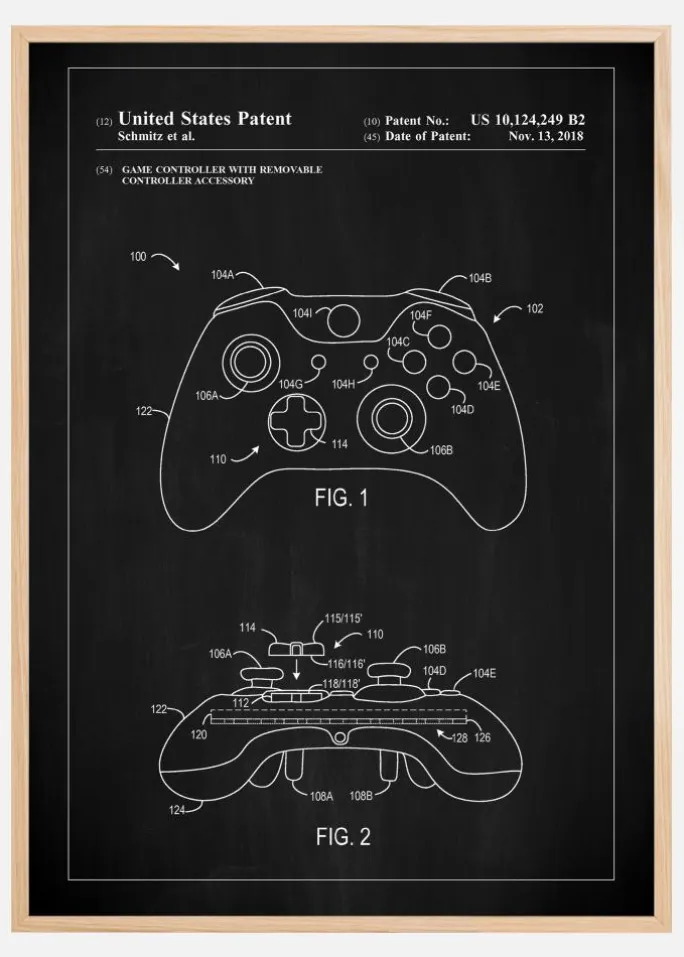 Denne patentplakat med en sort tavlebaggrund fremhæver elegant en moderne spilstyring til Xbox med aftageligt tilbehør, patentnummer US 10,124,249 B2, dateret den 13. november 2018. Det avancerede design og dets komponenter er visuelt fremstillet i detalje, hvilket giver indsigt i, hvordan teknologi og spiloplevelse kan tilpasses til brugeren. Det er en manifestation af den kontinuerlige innovation, der sker inden for spilstyringens verden.