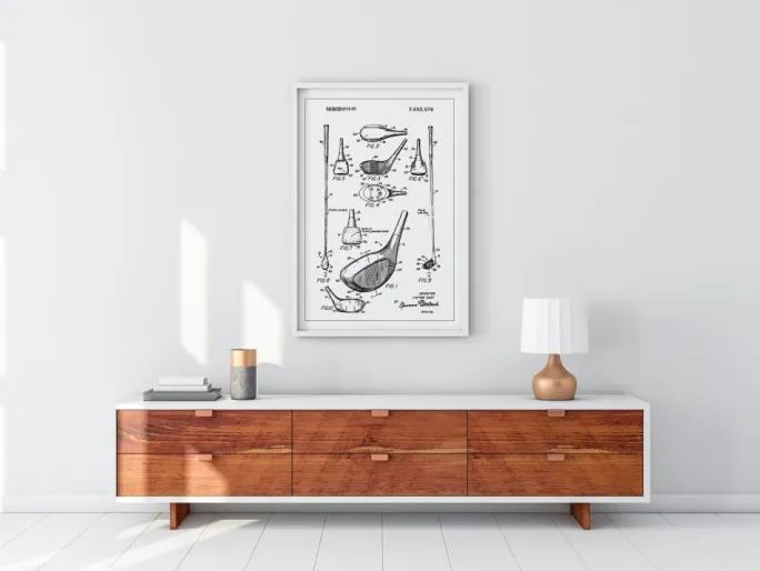 Den sort-hvide patent plakat er en sofistikeret vægkunst, der egner sig godt til kontorlokaler, klubhuse og endda hjemmeindretning for den golfinteresserede. Den tydelige fremstilling af køllens forskellige sektioner og vinkler gør den til et diskussionsskabende kunstværk, der formidler en følelse af historiens nyskabende ånd. Perfekt for samlere eller som en del af en stilfuld indretning, inviterer denne plakat til refleksion over sportens og teknologiens sammenfletning.