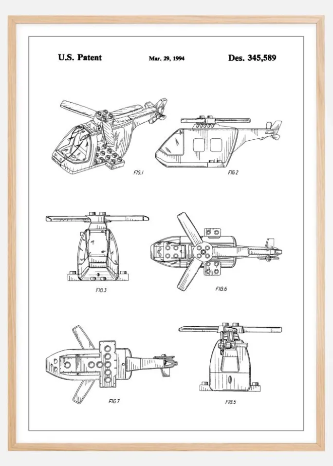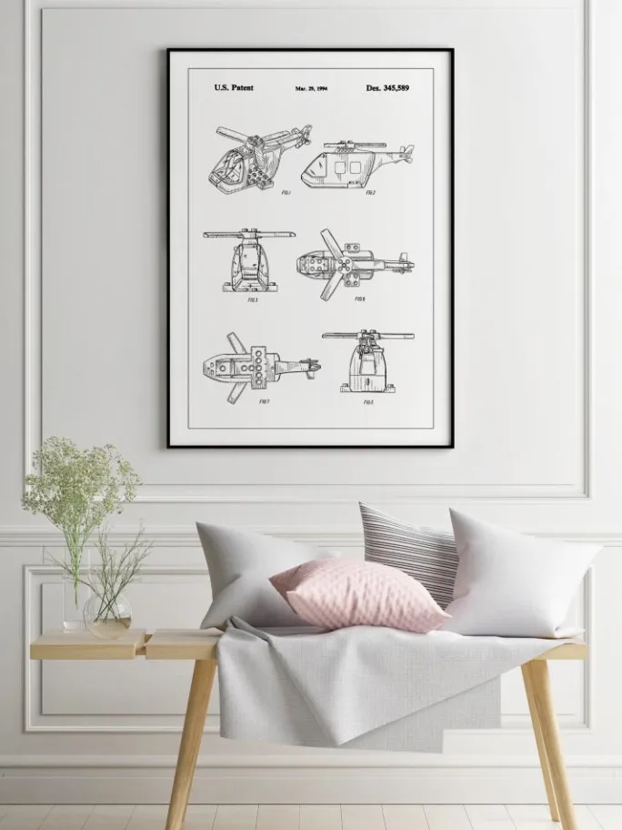 Opdag denne unikt stilfulde patentplakat, som skildrer en innovativ helikopterkonstruktion fra Lego, detaljeret præsenteret gennem en serie af tekniske tegninger. Denne patenttegning er ikke kun et fantastisk samtaleemne, men også en hyldest til menneskelig opfindsomhed, perfekt til at pryde væggene i hjemmet eller på kontoret. Skabt til at fængsle og inspirere, illustrerer denne patentplakat de indgående komponenter, som favner både kunst og videnskab inden for flyteknik.