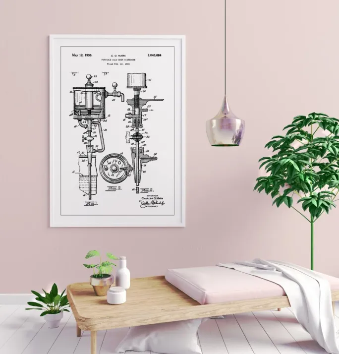 Denne kunstfærdige patentplakat afbilder det indgående design af en bærbar kold ølaftapper, som blev patenteret af Charles O. Marx den 12. maj 1936. Patentnummeret 2,040,664 præsenteres stolt ovenfor det omhyggeligt skitserede apparat, hvor hver linje og detalje giver liv til en unik skabelse fra den industrielle æra. Den elegante sort-hvide kontrast gør denne patenttegning til en tidløs indretningsdetalje, der passer perfekt ind i alt fra en sofistikeret lounge til en entusiasts samlingsrum.