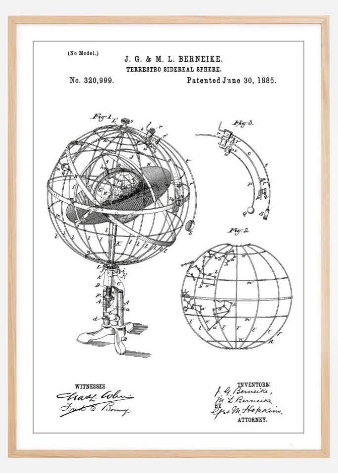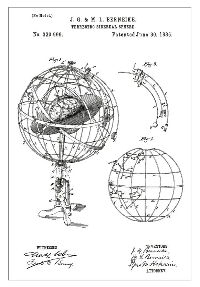 Udforsk himlens mysterier med denne stilfulde og intellektuelle patent plakat, der fremhæver J.G. & M.L. Berenikes opfindelse, “Terrestro Sidereal Sphere”, patenteret den 30. juni 1885, med patentnummer 320.999. Denne patenttegning viser en omhyggeligt konstrueret astronomisk apparat, der blev brugt til at modellere stjernernes og planeterne bevægelser i forhold til jorden, hvilket gjorde den til et vigtigt værktøj for datidens astronomer og opfindere.