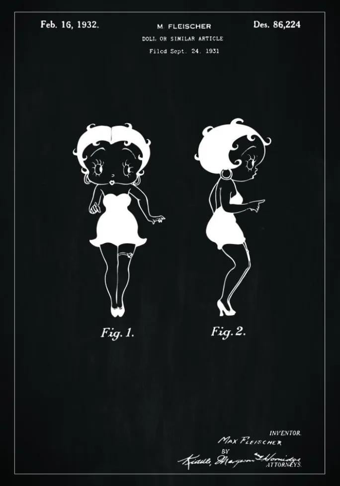 Denne charmerende patentplakat repræsenterer en dukke, der forestiller Betty Boop, designet af M. Fleischer, og blev tildelt et designpatent den 16. februar 1932 under patentnummer Des. 86.224. Patentanmodningen blev indgivet den 24. september 1931 og viser to figurer af dukken, en forfra og en fra siden, hvilket giver en komplet forståelse af dukkens design og karakter. Dette patentdokument indfanger den distinkte stil og personlighed, der var populær på den tid.