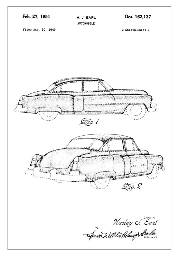 Denne patentplakat præsenterer en sofistikeret biltegning af en Cadillac, designet af den berømte H.J. Earl. Dateret den 27. februar 1951, med patentnummer Des. 162,137, som oprindelig blev indsendt den 10. august 1949, fanger dette billede essensen af efterkrigstidens bilindustri. Motivet er en hyldest til den amerikanske bils gyldne tidsalder og er fremstillet med en opmærksomhed på detaljer, der tiltaler både bilproducenter og designelskere.