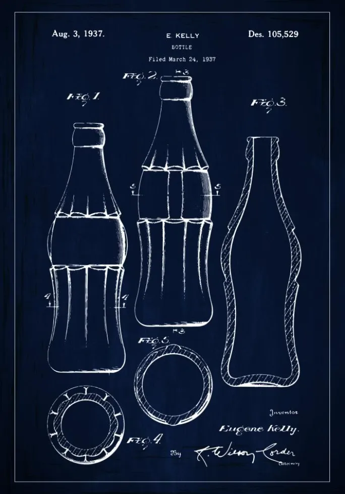Denne patentplakat illustrerer et designpatent for en CocaCola-flaske, som blev tildelt den 3. august 1937 under patentnummer Des. 105.529. Opfinderen, Eugene Kelly, stod bag dette klassiske designpatent, der blev indgivet den 24. marts 1937. Tegningerne viser flaskens form fra forskellige perspektiver, inklusive en forside, en opstakket gruppe, en profilvisning samt to tværsnitsvisninger. Detaljerne og proportionerne fremhæver den distinkte og genkendelige kontur, som er blevet ikonisk over hele verden.