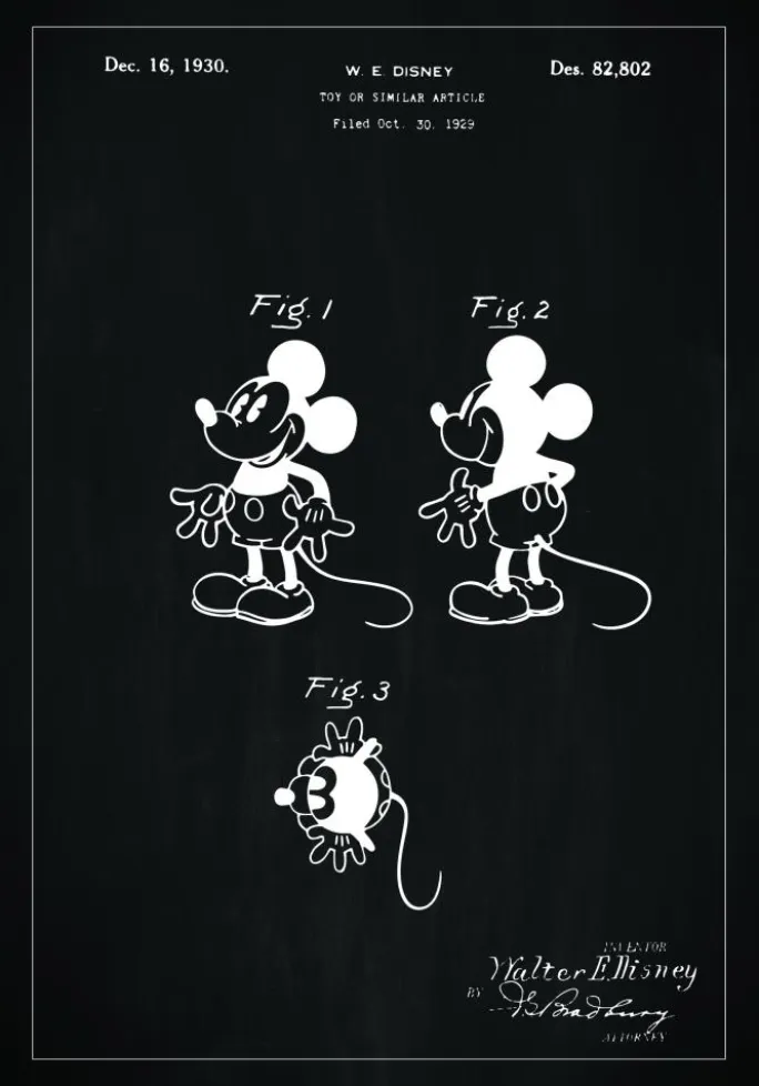 Denne unikke patentplakat viser et klassisk design af Mickey Mouse med store, runde ører og karakteristiske handsker, fastlagt gennem dens patenttegning, der er dateret til 16. december 1930. De tre illustrationer, som præsenteres på patentplakaten, demonstrerer forskellige figurer: en stående, en i profil og en detalje af hånden. Hver figur er nummereret, hvilket giver et klart overblik over designets forskellige aspekter.