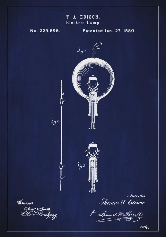 Genoplev et monumentalt øjeblik i historien med vores patentplakat af Thomas A. Edisons elektriske lampe, en ikonisk opfindelse der har oplyst verden siden patentet blev givet den 27. januar 1880 med nummer 223,898. Denne patenttegning giver et detaljeret kig på Edisons originale design og konstruktion af lampen, og tilføjer en industriel og historisk følelse til ethvert rum. Plakatens dristige linjer og klarhed gør den til et elegant tilskud til en samlingsvæg eller som et enkeltstående kunstværk.
