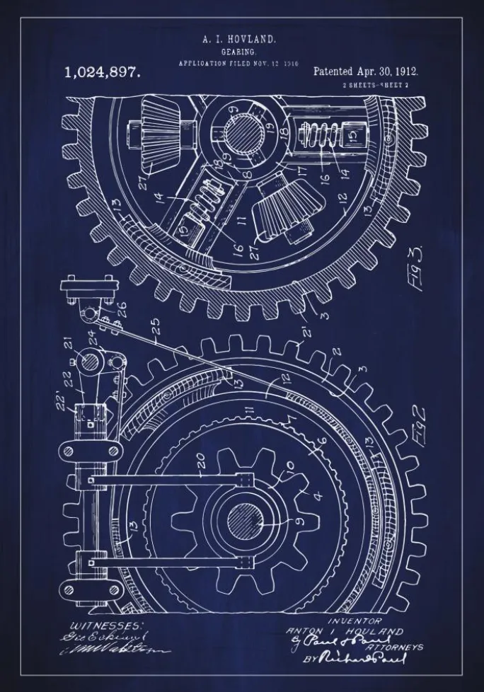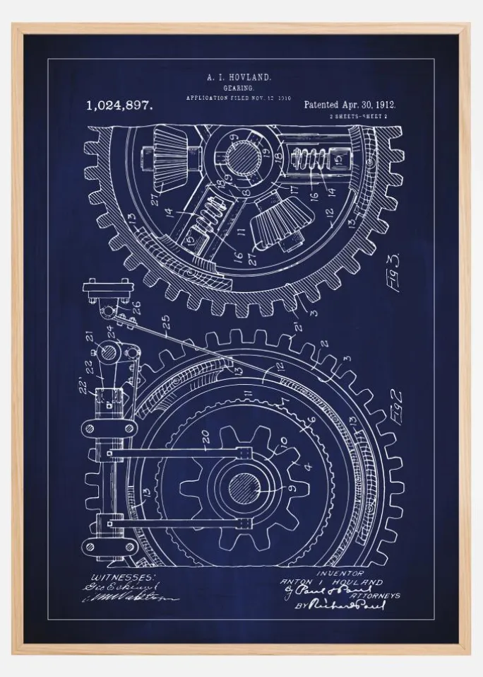 Dekorer dit rum med denne elegante patentplakat, som detaljeret skildrer A. I. Hovlands opfindelse af en gearkassemekanisme, patentnummer 1.024.897, givet den 30. april 1912. Dette indviklede arbejde af teknisk tegning fremhæver en epoke af innovation og mekanisk konstruktion. Med sin dristige kontrast og komplekse illustrationer er dette en charmerende tilføjelse til en ingeniørs kontor, et værksted, eller enhver industriel sammenhæng, hvor maskineri og design værdsættes højt.