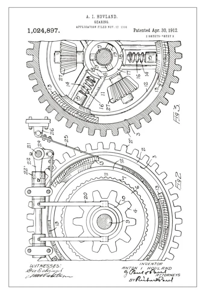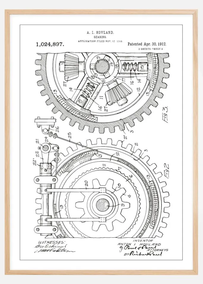 Pryd din væg med denne klassiske patentplakat, der præsenterer A. I. Hovlands indviklede gearkassedesign, patentnummer 1.024.897, givet den 30. april 1912. Denne detaljerede tegning fremhæver den tekniske dygtighed og kompleksiteten i tidlige mekaniske konstruktioner. De indviklede linjer og omhyggelige detaljer i denne patenttegning tilbyder en dybere forståelse for ingeniørkunstens historie og er et imponerende supplement til enhver teknisk eller industriel indretningsstil.
