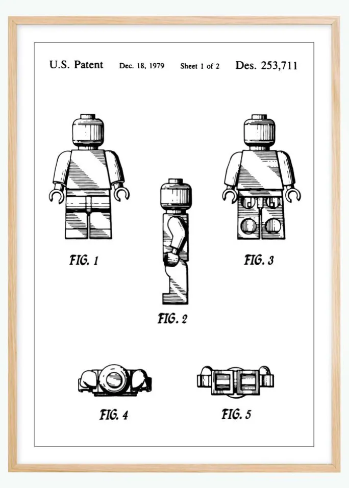 Denne patentplakat præsenterer en klassisk byggbar Lego-figur, hvilket er et tidløst og kreativt legetøj, som har fængslet børns fantasi i generationer. Bevilget den 18. december 1979, under patentnummer Des. 253,711, viser tegningen en byggbar figur i flere visninger, som demonstrerer legetøjets modulære design og fleksibilitet. Det er en enkel, men samtidig genial repræsentation af konceptet med interaktiv og pædagogisk legetøjsleg.