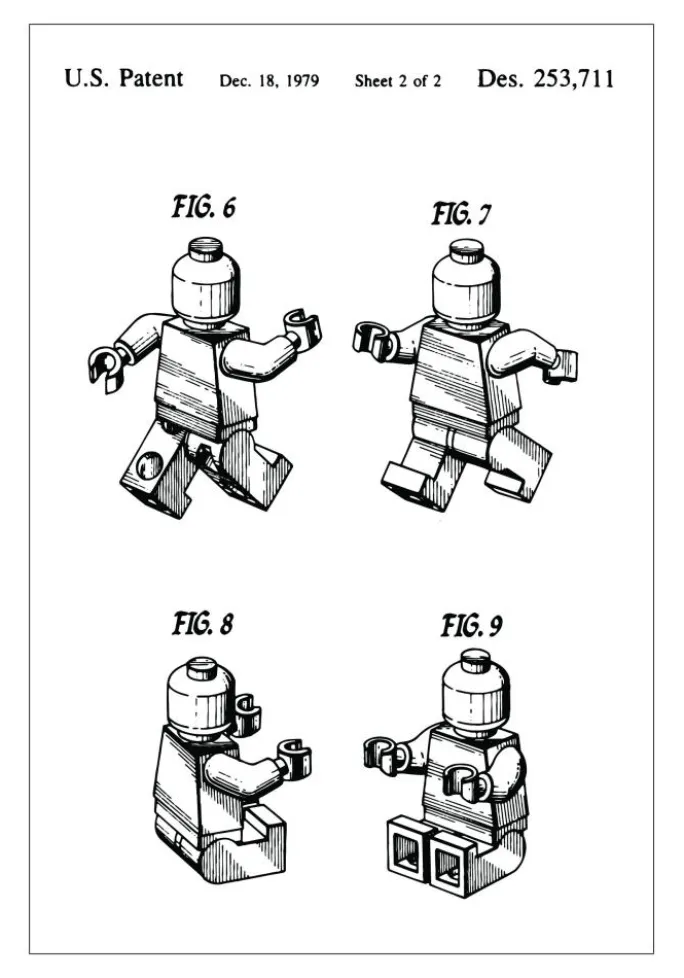 Denne patentplakat skildrer en Legofigur, som blev registreret i det amerikanske patentkontor den 18. december 1979 under patentnummer Des. 253,711. Illustrationen viser fire forskellige positioner af legetøjsfiguren, hvilket giver en dynamisk og tredimensionel opfattelse af dens design og funktionalitet. Hvert billede viser figurens bevægelighed og de forskellige positurer, den kan indtage.