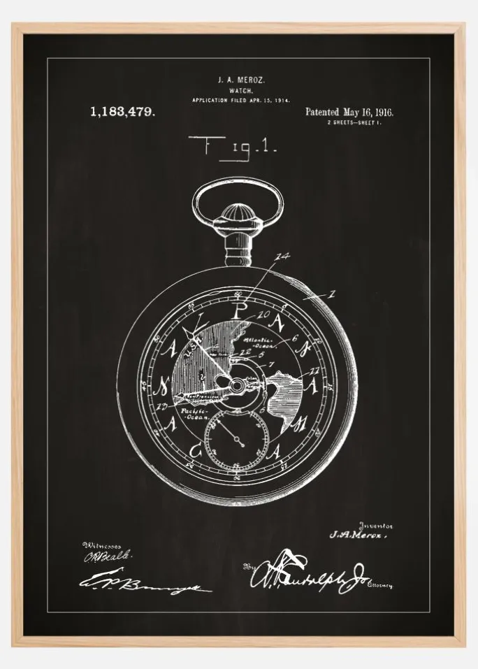 Denne sofistikerede patentplakat afbilder den tidløse opfindelse af et lommeur, patenteret af J.A. Meroz den 16. maj 1916, under patentnummer 1.183.479. Den detaljerede patenttegning viser et indviklet design af urværket, komplet med mekaniske detaljer, der afspejler den æra, hvor præcisionen i tidsmåling blev en kunstart i sig selv.