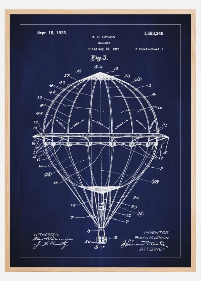For den sande entusiast af tidlige flyvetekniske fremskridt, tilbyder denne patentplakat et indblik i den glorværdige æra af luftfartspionerer. Præsenteret den 15. september 1925, illustrerer denne patenttegning, nummer 1.553.340, en luftballon designet af Ralph H. Upson, som repræsenterer en vigtig milepæl i aerodynamisk design og konstruktion. Denne plakat er en uvurderlig repræsentation af menneskelige stræben og drømme om himmelske eventyr.