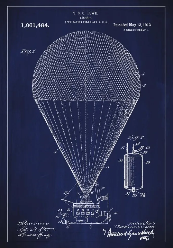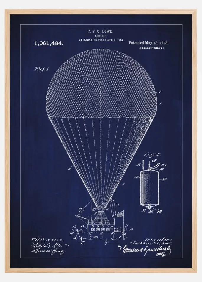Med stolthed præsenterer vi denne patentplakat, der skildrer T. S. Lowe’s luftskib, en opfindelse der markerede et fremskridt i tidlig luftfart. Patentet, med nummer 1,061,484, blev givet den 13. maj 1913 og bærer med sig en tid af eventyr og innovation. Denne plakat er en hyldest til det tidlige 1900-tals kreative ånd og tekniske drømme.