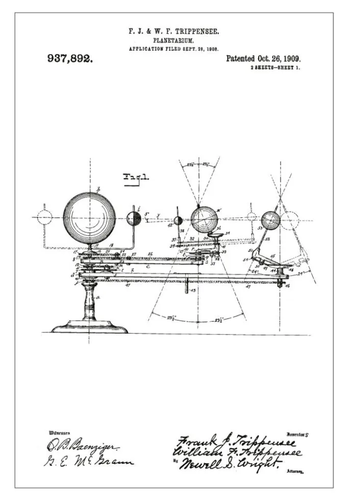 Denne elegante patentplakat er en hyldest til ingeniørkunsten og studiet af himmellegemer, med en detaljeret gengivelse af F. J. & W. F. Trippensees planetarium, en klassisk opfindelse fra tidligt 1900-tal. Patentet, nummer 937.892, blev registreret den 26. oktober 1909, og ansøgningen blev indgivet den 28. september 1908. Dette kunstnerisk gengivne patentdokument er en unik indretningsdetalje, der tilbyder både en historielektion og en samtalestarter. Den er ideel for den videnskabsinteresserede eller for at give en akademisk følelse i hjemmet, kontoret eller klasseværelset.